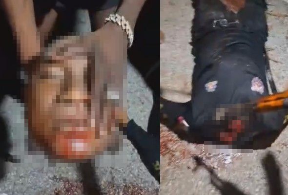 頭と胴体が分かれました。斬首した相手の死体を晒し上げるギャングメンバー