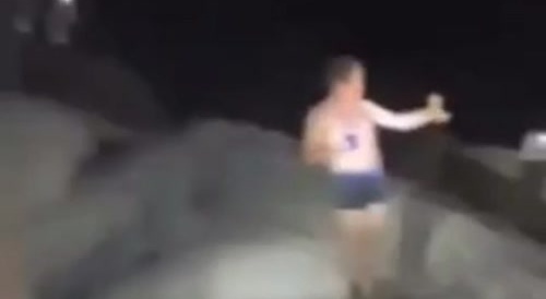花火が爆発して手が破壊された酔っ払い、破壊された手を群衆に見せつける
