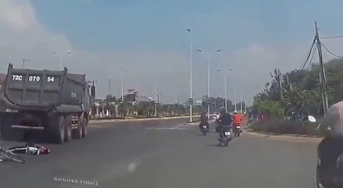 トラックの目の前を走っていた自転車乗りは、自転車ごとトラックに轢かれました。