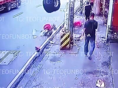 男性が歩いていると後ろからタイヤが飛んできて男性と衝突。