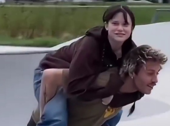 彼氏が彼女を背負いながらスケボーに乗ろうとしますが…。