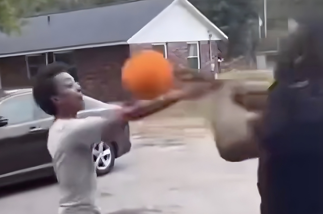 手に持っていたバスケットボールを女性の顔面に投げつけました。