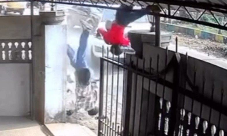 予期せぬ訪問者が空から飛んできた、オートバイが車と衝突